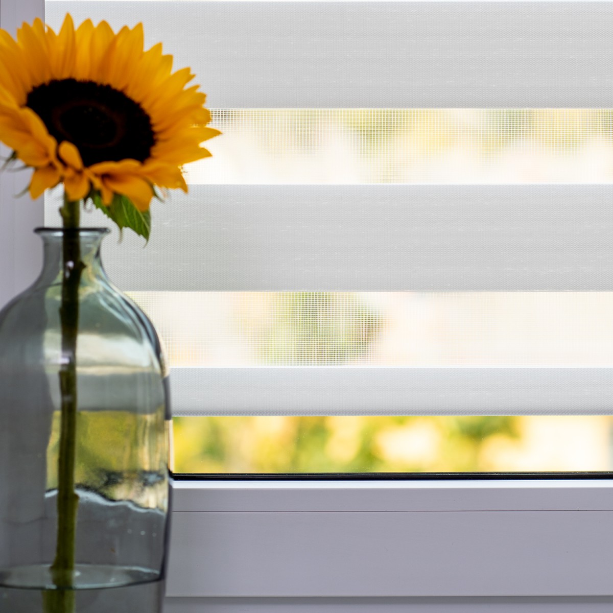 Шторы состоят из двух полотен. Каждое из них сделано из плотных и полупрозрачных полос белого цвета. При движении полосы смещаются, таким образом можно регулировать степень освещенности в помещении.