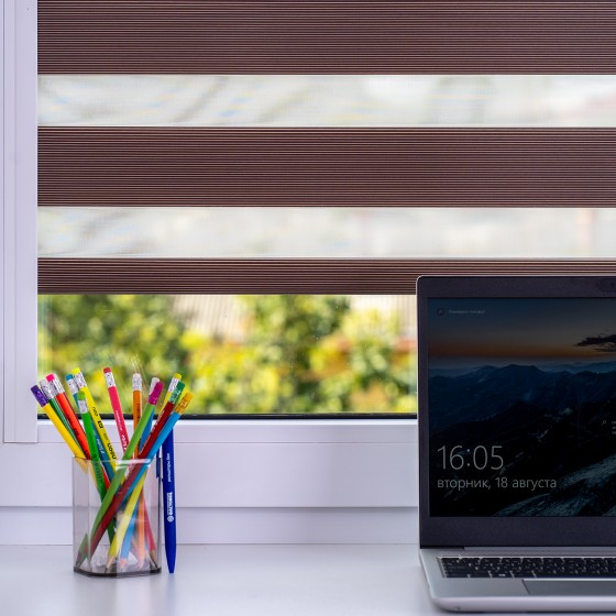 Рольшторы «День-Ночь» цвета мокко (артикул цвета mocha2305) являются одними из самых интересных в коллекции Songes. Несмотря на то, что стоимость на коллекцию Songes несколько выше, нежели чем на другие рольшторы «День-Ночь», рулонные шторы из этой коллекции широко востребованы среди наших покупателей. Это легко объяснить изящным дизайном и необычным оформлением. В основе полотна лежат две полоски, одна из которых прозрачная, другая нет. Перемещая части тканей можно перемешивать их относительно друг друга, что дает возможность регулировать свет.