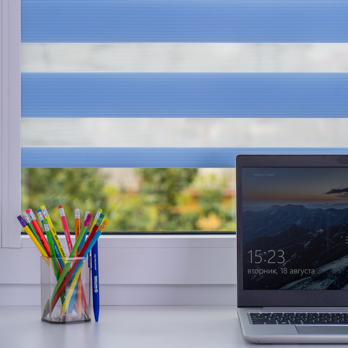 Рольшторы «День-Ночь» коллекции Songes небесного цвета (артикул цвета sky2307). Их основное отличие – «полосатость»: прозрачные полосы чередуются с непрозрачными. Рольштора состоит из единого полотна, прокручивающегося по кругу: выходит, что прокручивая цепочку, возможно, настраивать 2 положения – раскрытое (если 2 прозрачные полосы словно «встретились») картинка просматривается и закрытое (если встречаются прозрачная, а также непрозрачная полосы) картинка не вырисовывается, но в здание попадает мягкий рассеянный свет.